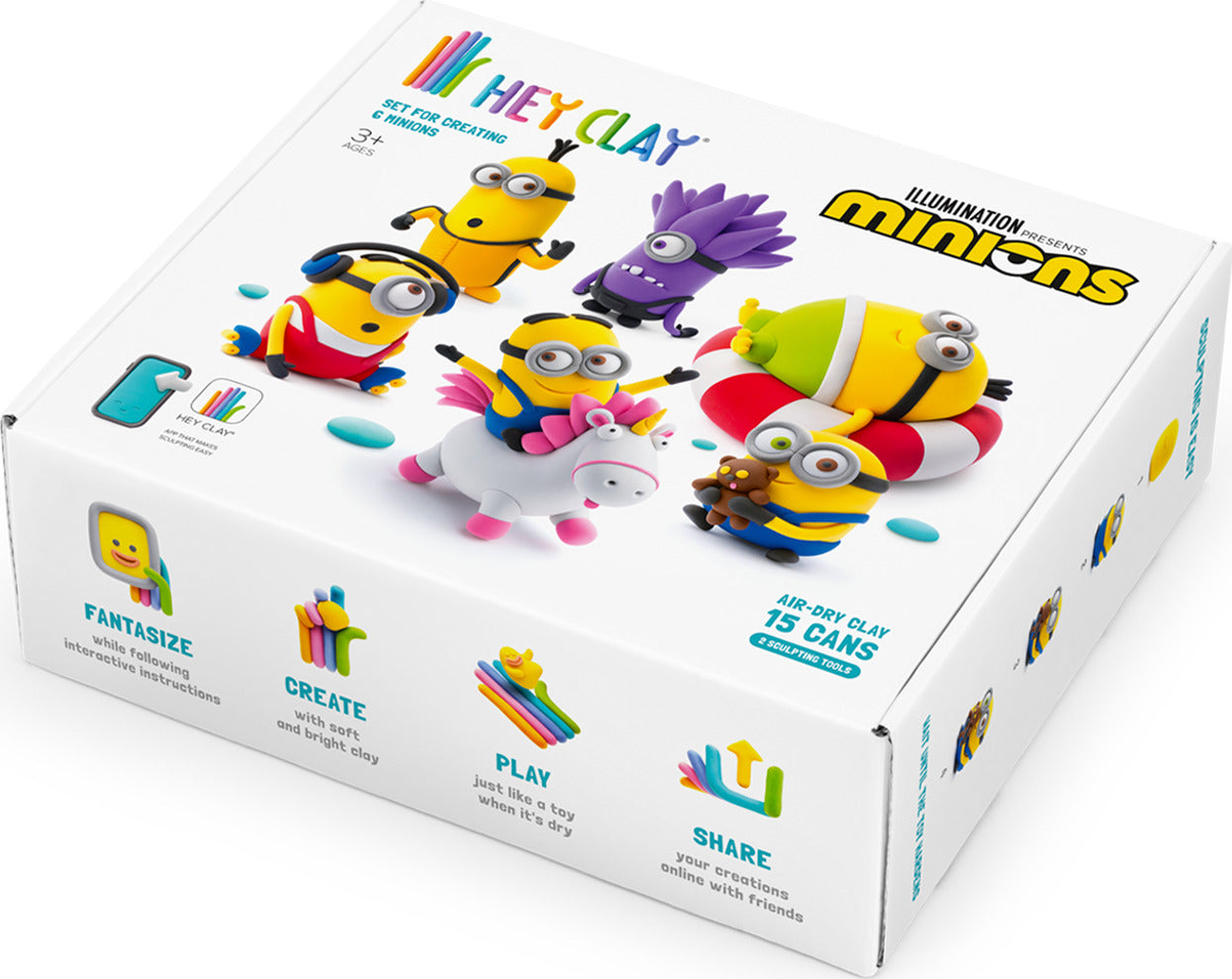 Spheres, cylinders, facial features, textures, and more... Kids learn real sculpting techniques without even realizing it! Bring your own villainy adventures to life with the Hey Clay Minions set. Hey Clay Minions High-quality clay and interactive app for molding 6 Minion figurines Encourages fine motor skills, spatial reasoning, creativity.